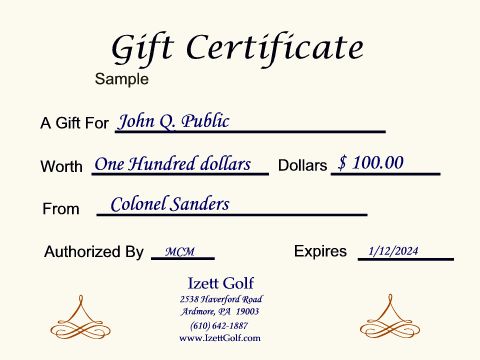 Please contact us directly for gift certificates. Either via phone [(610) 642-1887] or by email [mike@izettgolf.com]. If by email, please provide a telephone contact number. We can deliver a gift certificate either via the US Postal Service or electronically via return email. We prefer to handle payment information exclusively via a direct connection over the phone.